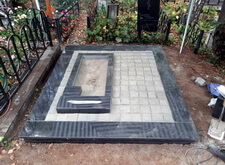 Когда подготовительные работы на территории могилы были завершены, мы принялись за укладку брусчатки на пескобетон, сама плитка была уложена вровень с облицованным гранитными плитами цоколем. Параллельно с этим мы подготовили основание для последующей установки надгробья.