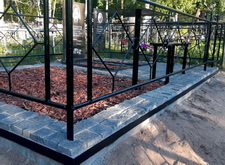 Дождавшись, пока покрытие высохнет, мы приступили к последней фазе работы. В цветники и специальную нишу, которую по желанию клиента не стали закладывать брусчаткой, засыпали мульчу. После этого протёрли памятники и ограждение. Могила готова, заказчик остался нами доволен.